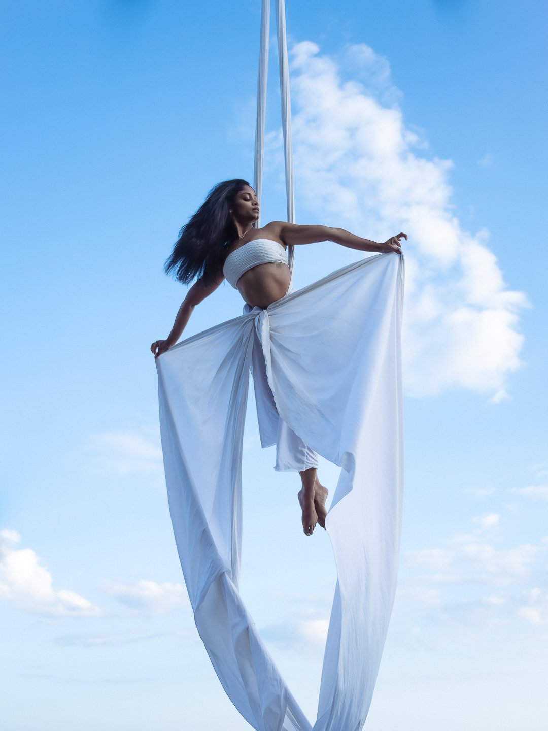 Suspended in the air from unimaginable heights, let me wow your audience with dramatic twirls, spins, and drops from the ceiling!
